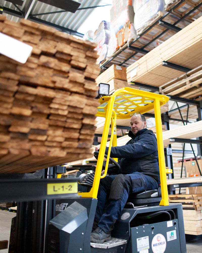 Je vervoert materialen en elementen met de heftruck door onze woningfabriek in Uden. En alles komt zonder schade aan, netjes op z’n plek.