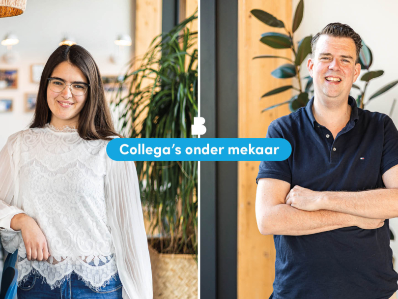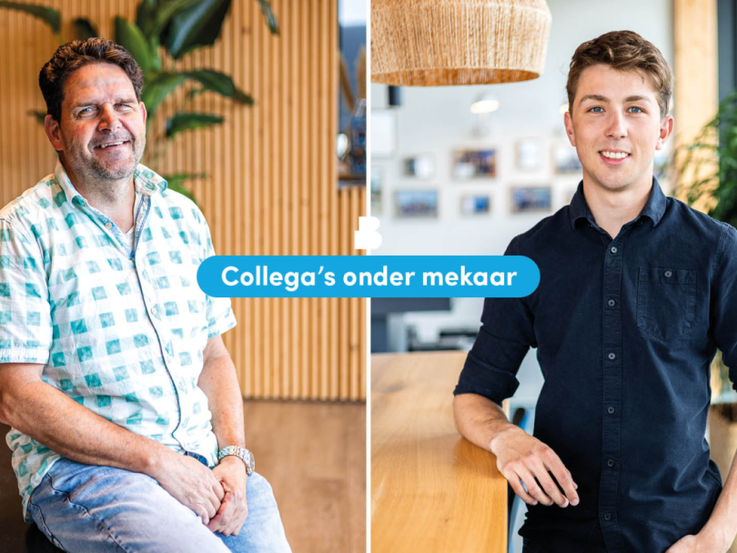 Collega's onder mekaar: calculator Arno en assistent klant & markt Matthijs